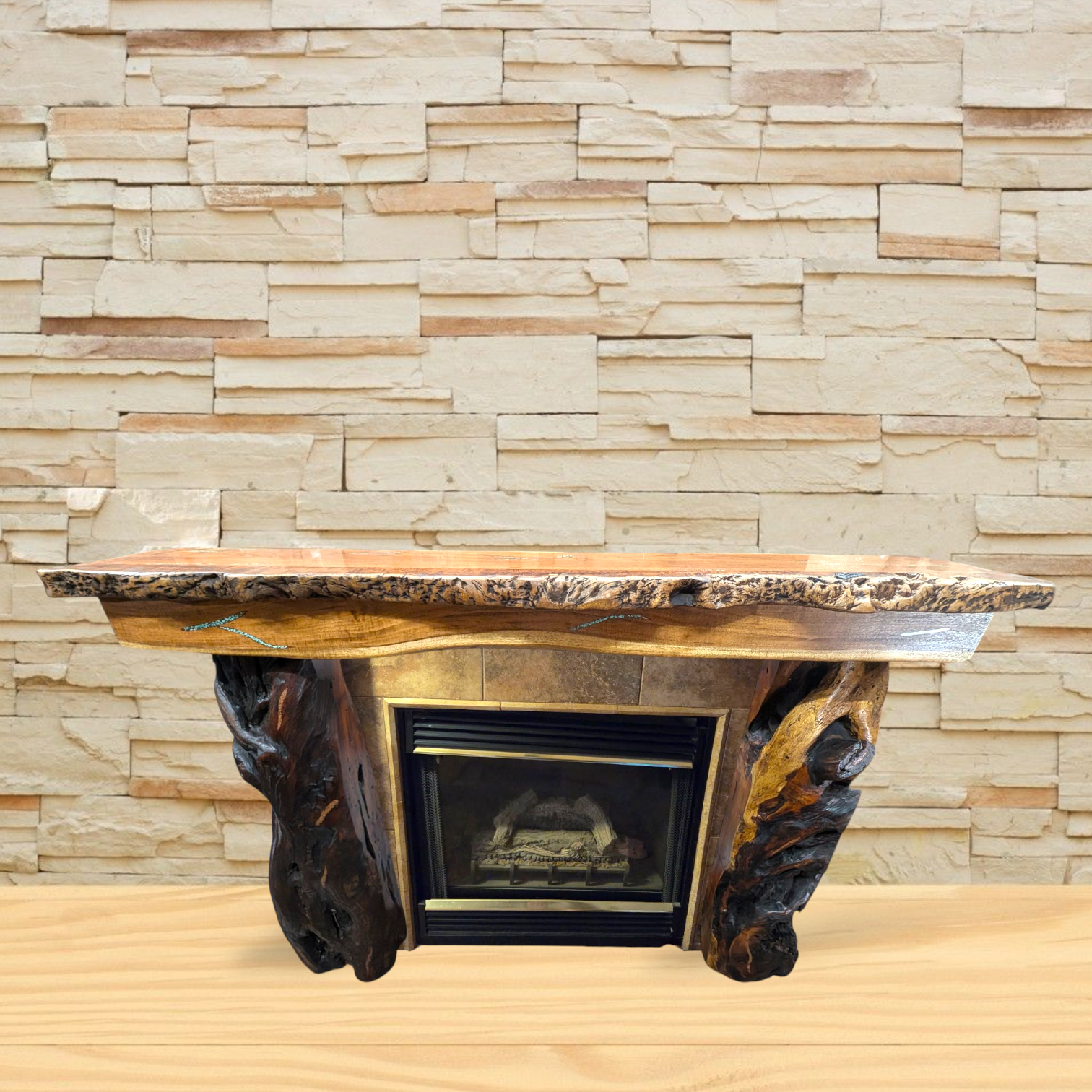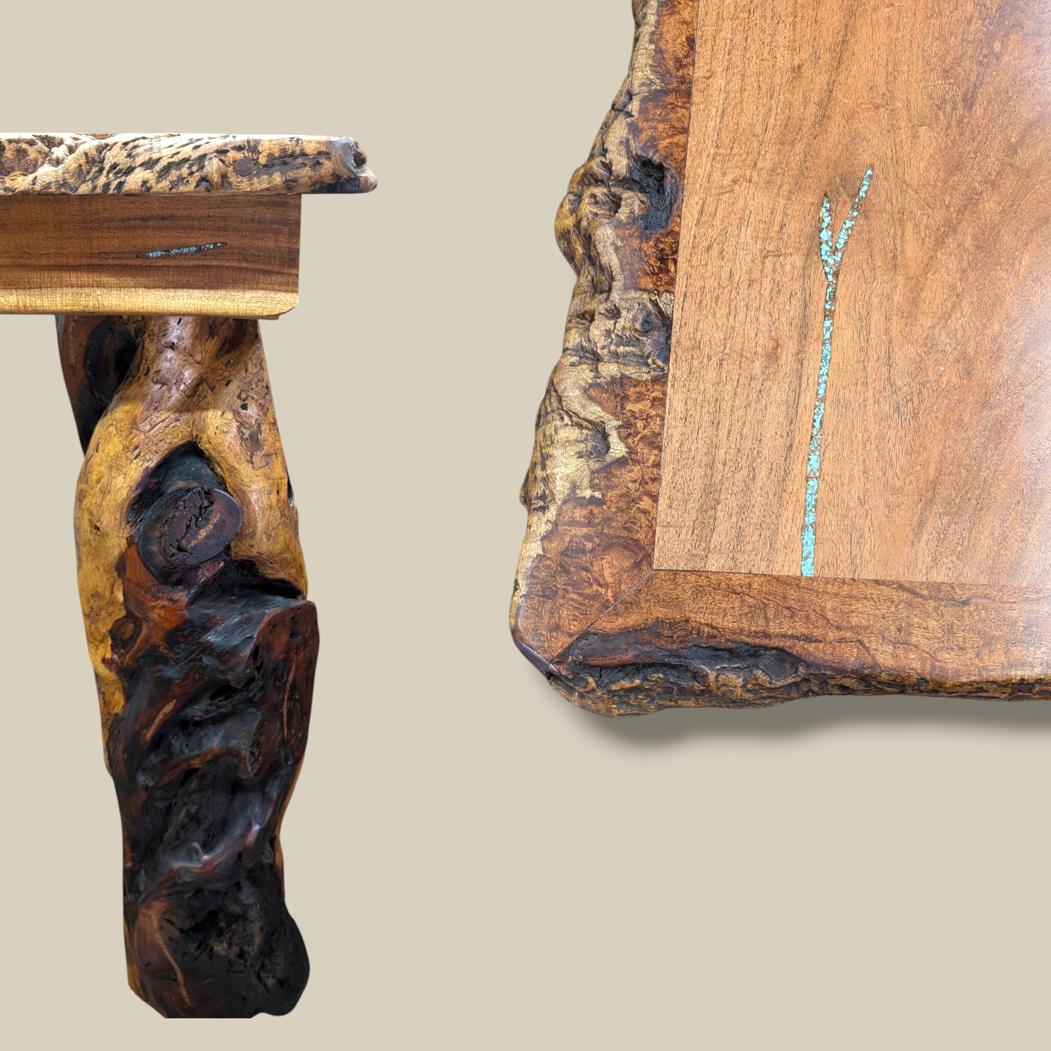 Custom design inspired by our mesquite sofa tables with root base, this customer had specific measurements to fit the space, the piece must had a lot of character, turquoise and copper inlay on the top and copper only inlay on each leg that were made with the actual mesquite tree trunk.